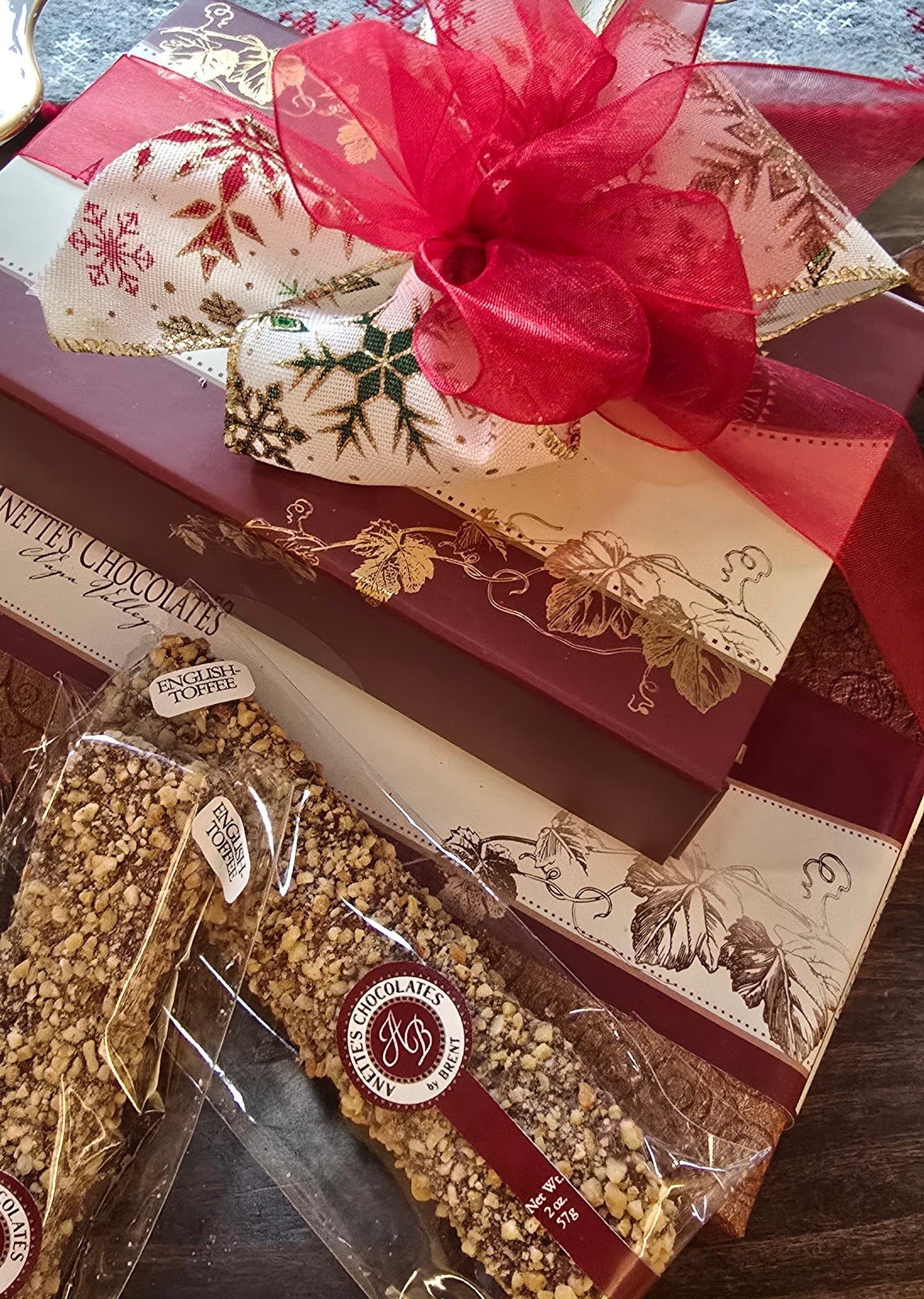 Top Box:   Five English Toffee Bars (6" long each), Toasted Almonds, Milk and Dark Chocolates, Buttery Crunchy Toffee.